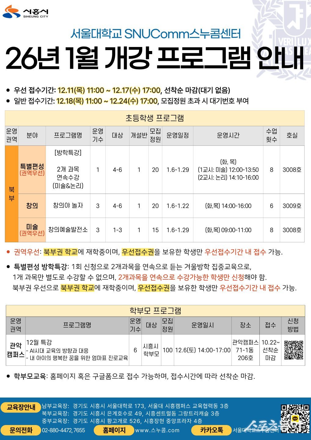 스누콤 방학 특강과 1월 개강 프로그램 수강생 모집은 스누콤 누리집을 통해 진행된다. 우선접수권 보유자는 12월 11일부터, 일반 접수는 12월 18일부터 신청할 수 있다.