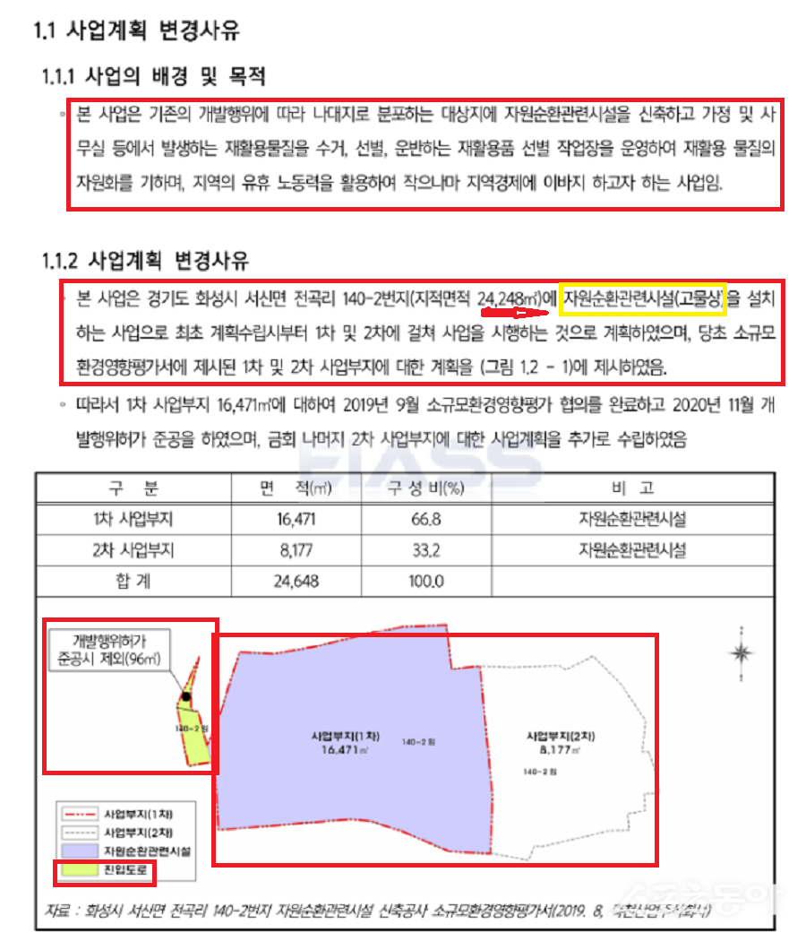 경기도 화성시 서신면 전곡리 140-2번지 일대에서 자원순환시설로 허가를 받은 A업체가 허위공문서 작성 및 위계에 의한 공무집행방해 의혹을 받고 있다(평가서). 사진제공|공익 제보자