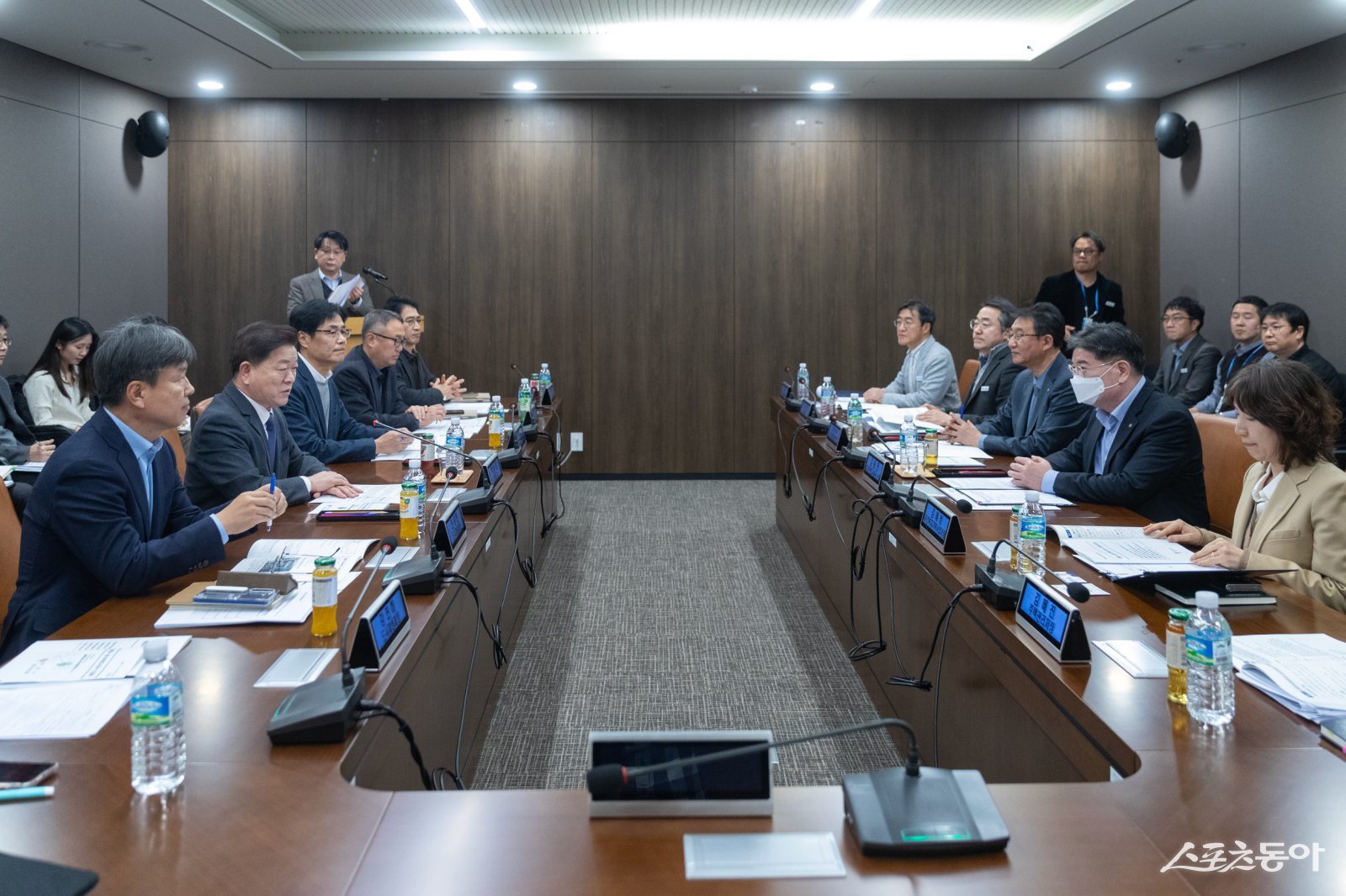 박승원 광명시장(사진 왼쪽 두 번째)이 16일 오후 GH 광교 본사를 찾아 김용진 GH 사장(사진 오른쪽 두 번째)에게 광명시흥 3기 신도시, 구름산지구 등 주요 개발사업 신속한 추진을 촉구하고 있다. 사진제공|광명시