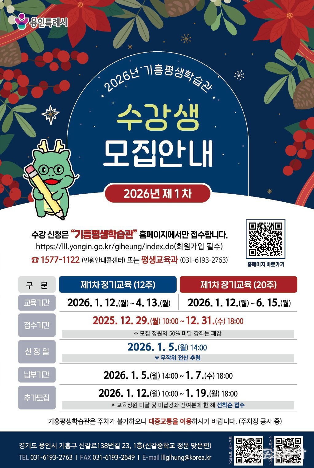 용인특례시(시장 이상일) 기흥평생학습관은 오는 29일부터 31일까지 시민을 대상으로 ‘2026년 제1차 정기·장기교육’ 수강생을 모집한다고 21일 밝혔다.