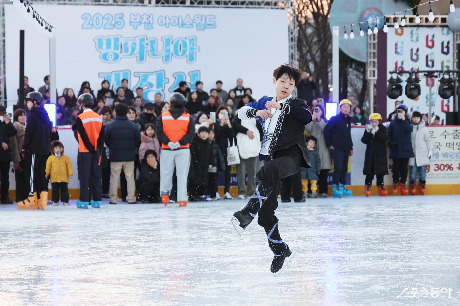 지난 19일, ‘빙파니아’ 개장식에서 부천시 피겨스케이팅 유망주 이윤호 선수의 축하 공연이 펼쳐졌다. 사진제공|부천시