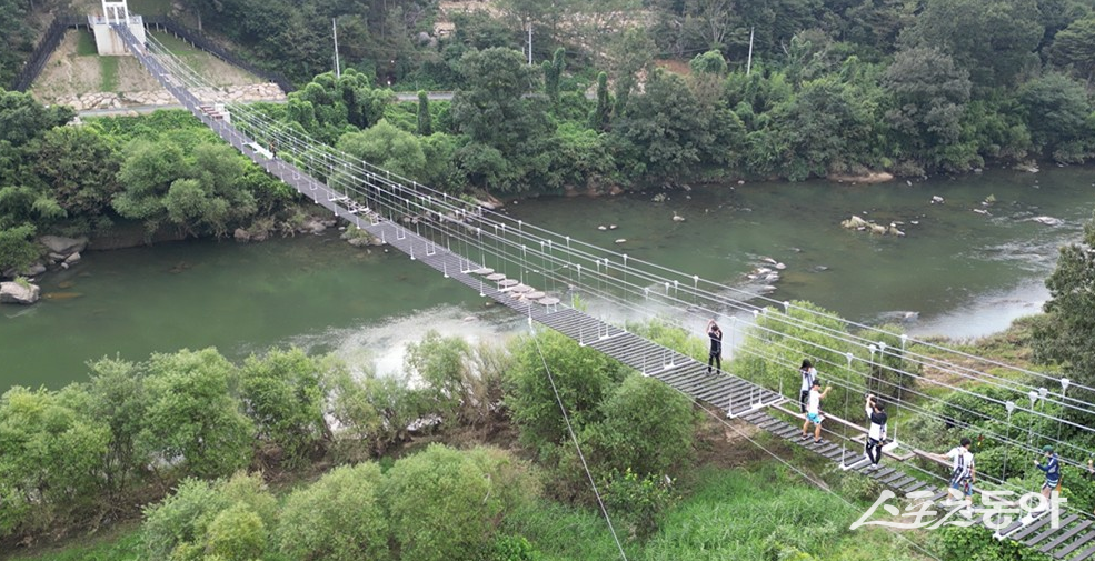 곡성군 죽곡면 대황강 출렁다리를 찾은 관광객들이 체험 프로그램을 즐기고 있는 모습. 사진제공=곡성군