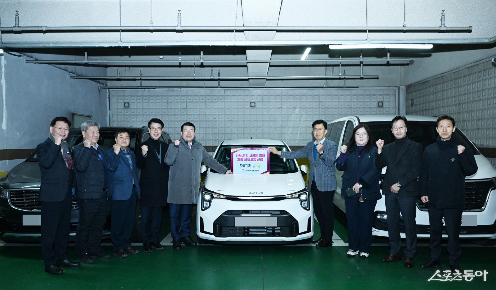 백경현 이사장(윈쪽 다섯번째)은 24일 사회복지공동모금회의 「2025년 기획사업 경기 사랑의 열매 차량 지원사업」에서 경차 1대를 지원받고 기념 촬영하고 있다. 사진제공ㅣ구리시
