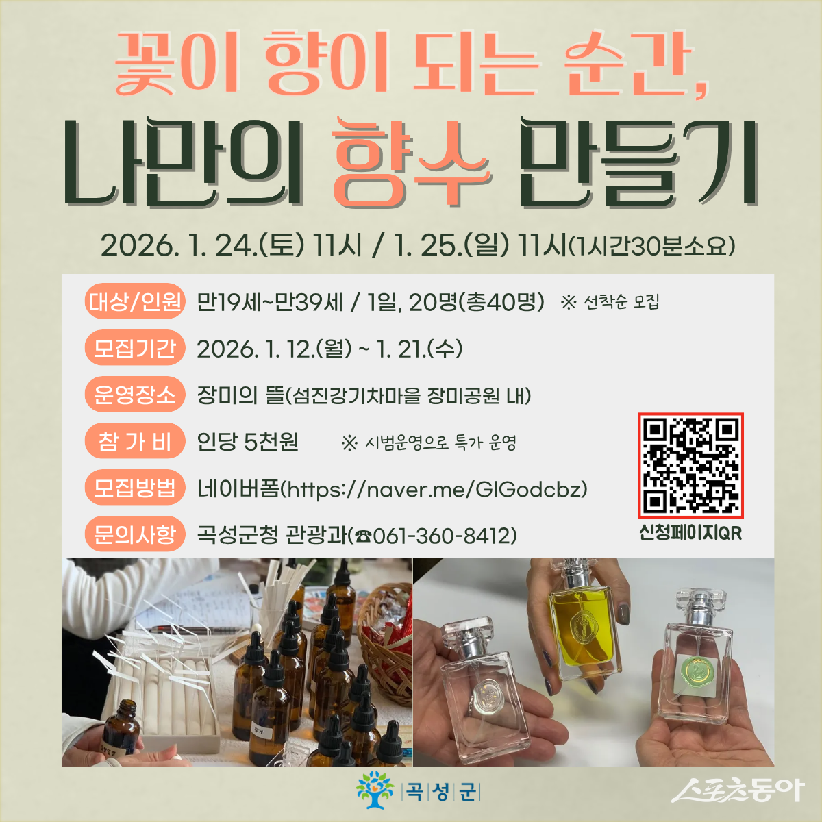 전남 곡성군이 섬진강기차마을 장미공원 내 ‘장미의 뜰’에서 오는 1월 24일부터 2월 1일까지 주말 4회에 걸쳐 ‘취향 맞춤형 향수 및 디퓨저 제작 체험’ 프로그램을 운영한다.