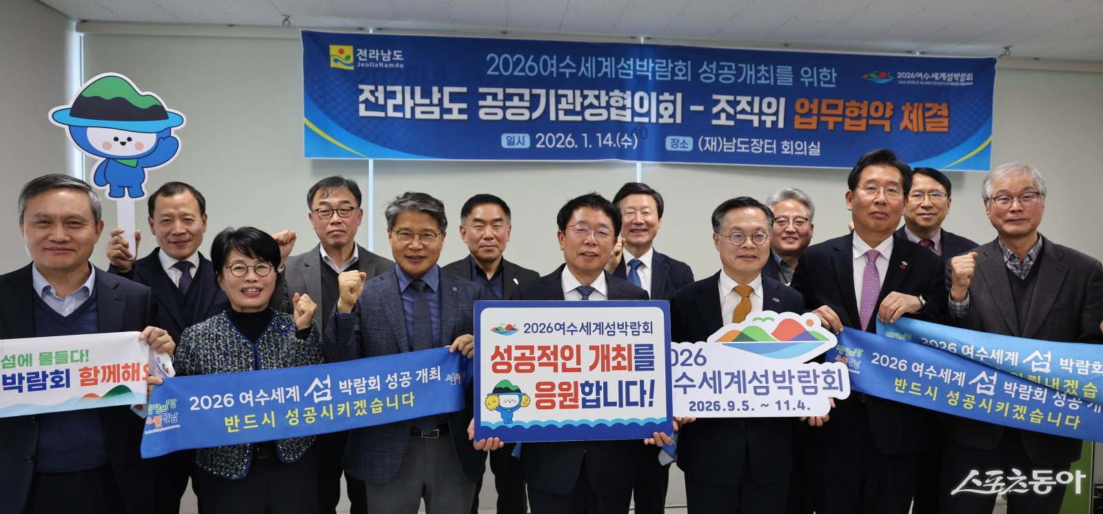 (재)2026여수세계섬박람회 조직위원회는 지난 14일 (재)남도장터 회의실에서 전라남도 공공기관·출연기관 기관장 협의회와 박람회 성공 개최를 위한 업무협약을 체결했다.