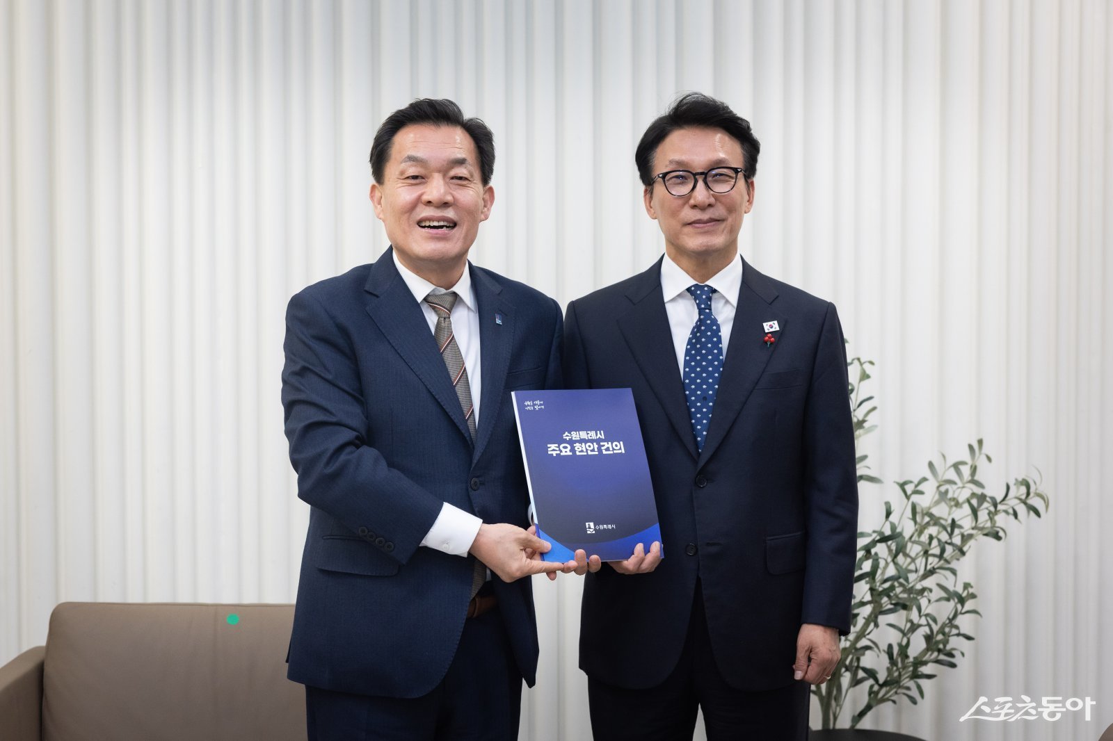 이재준 수원시장(왼쪽)이 김민석 국무총리에게 건의문을 전달한 후 기념촬영을 하고 있다. 사진제공|수원시