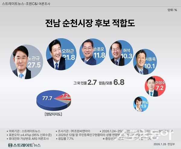 스트레이트뉴스가 조원씨앤아이에 의뢰해 지난 24~25일 순천시민 505명을 대상으로 실시한 여론조사 결과, 차기 순천시장 적합도는 노관규 현 시장 27.5%, 오하근 전 민주당 후보 21.8%, 손훈모 변호사 11.8%, 허석 전 시장 10.3%, 서동욱 전 전남도의장 10.1% 순으로 집계됐다.