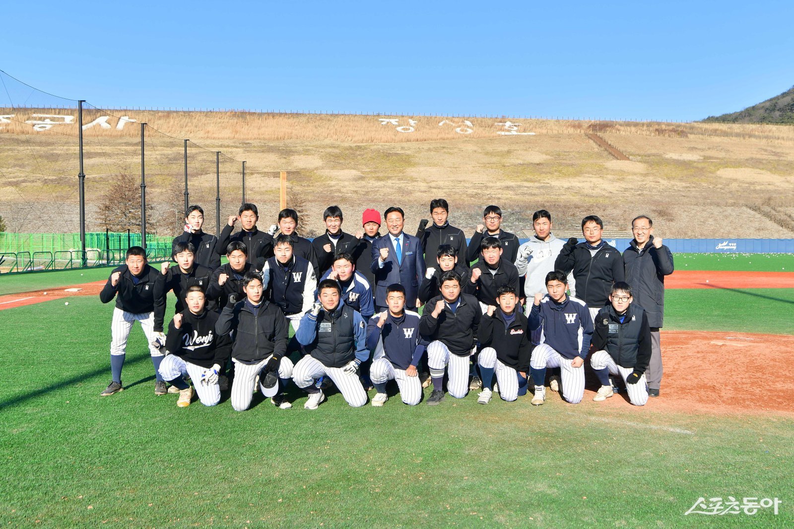김한종 장성군수가 지난 27일 원주고 야구 선수단이 동계 전지훈련 중인 장성호 체육공원을 방문해 선수들과 기념촬영을 하고 있다. 사진제공=장성군