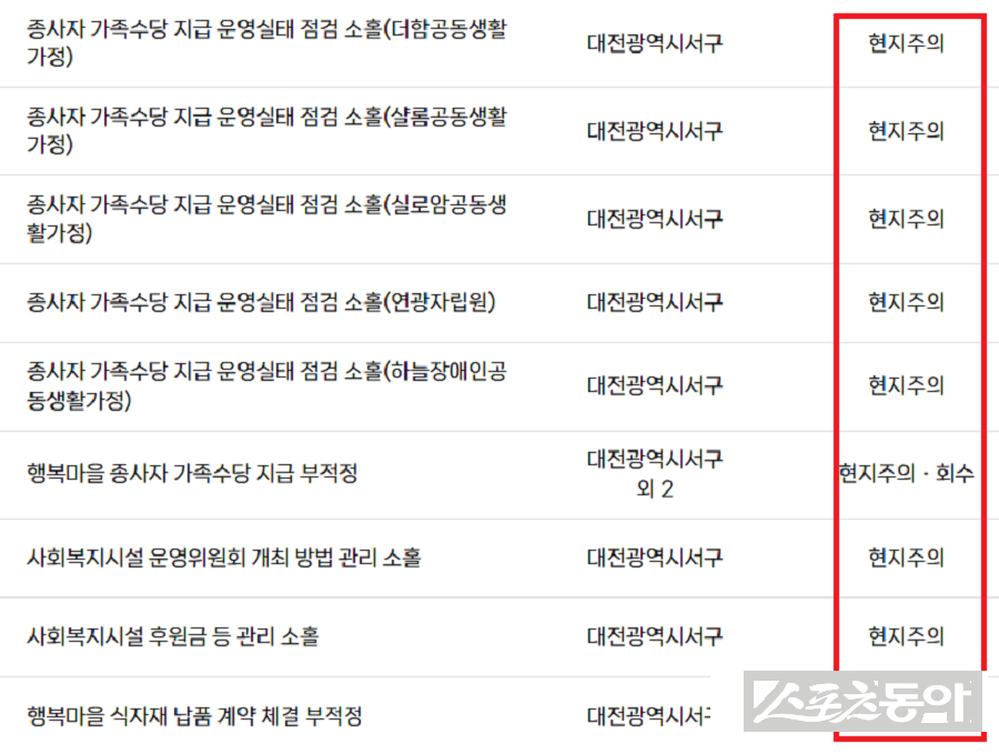 실제로 더함·샬롬·실로암·연광자립원·하늘장애인공동생활가정 등 여러 시설에서 종사자 가족수당 지급 운영 실태에 대한 관리·점검이 소홀했던 것으로 드러나 현지주의 처분이 내려졌다. 또한 ‘행복마을’의 경우 가족수당 부적정 지급과 식자재 납품 계약 체결 부적정, 비지정 후원금 집행 부적정 등으로 주의 및 회수 조치를 받았다.