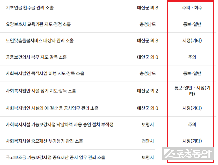 대표적으로 국고보조금 집행잔액 및 발생 이자 반납 업무가 제대로 이행되지 않아 충청남도에 대해 ‘회수’ 조치가 내려졌다. 의료급여비용 부당이득금 환수, 기초연금 환수금 관리 소홀, 장애아동수당 및 기초연금 부적정 지급 사례 등 재정 누수로 직결되는 사안들이 다수 확인됐다.