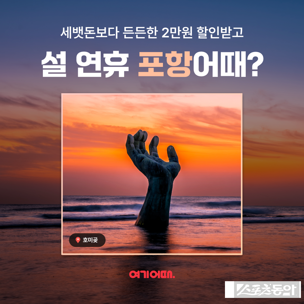 여기어때는 가족 단위 여행객이 많은 명절 연휴인 만큼 맞춤 여행 코스도 함께 정리해 소개한다. 포항의 맛을 느낄 수 있는 구룡포 대게거리와 포항의 멋진 자연 풍경을 바라보며 힐링할 수 있는 호미곶·스페이스워크 등 다양한 여행 스팟을 추천한다. 자세한 내용은 앱 이벤트 페이지에서 확인할 수 있다.