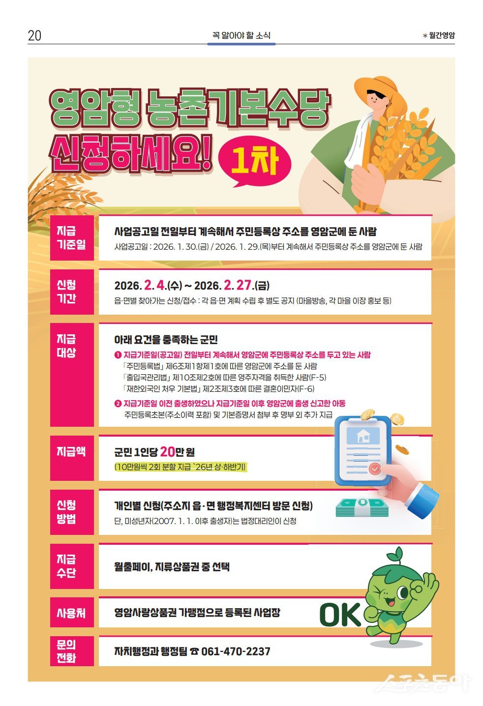 전남 영암군이 오는 4일부터 27일까지 군민의 지속가능한 삶을 지원하고 지역경제에 활력을 불어넣는 ‘영암형 농촌기본수당’을 지급한다. 3일 군에 따르면, 이번 1차 농촌기본수당은 주민등록상 올해 1/29일부터 영암군민인 사람에게 1인당 10만원을 지급하고, 결혼이민자(F-6), 영주자격 취득자(F-5)도 포함된다.
