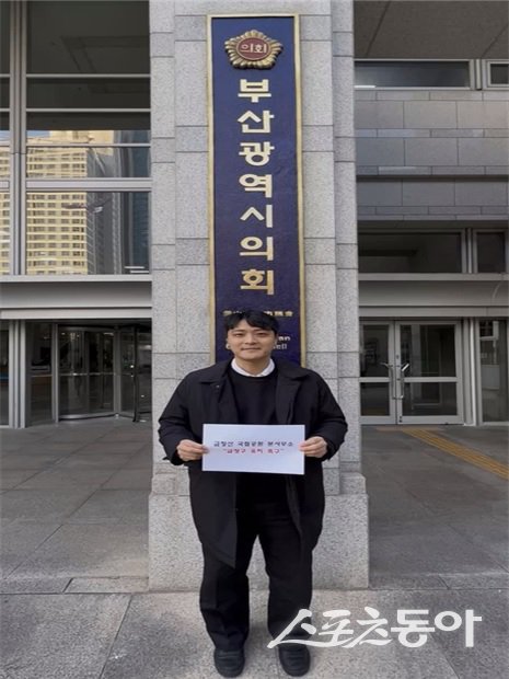 부산시의회 복지환경위원회 소속 이준호 의원(국민의힘, 금정구2)이 지난 2일 시의회 정문 앞에서 ‘금정산 국립공원 본사무소 금정구 유치’를 촉구했다.