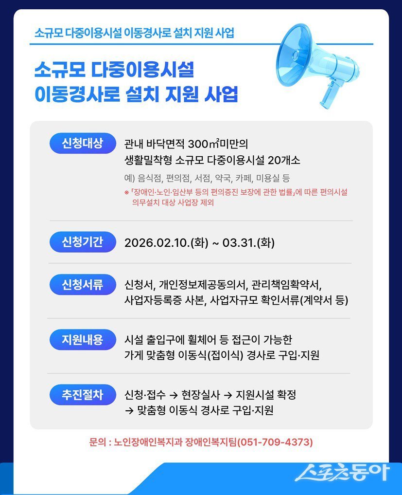 부산 기장군(군수 정종복)이 지역 내 소규모 다중이용시설을 대상으로 이동식(접이식) 경사로 설치 지원사업을 추진한다고 9일 밝혔다.