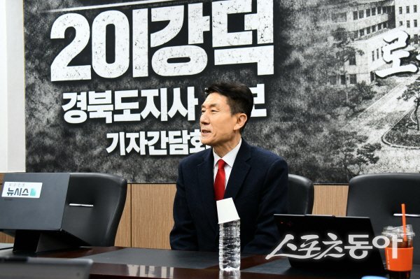 이강덕 경북도지사 예비후보가 국민의힘 경북도당 기자간담회에서 “이철우 경북도지사와 김정기 대구시장 권한대행은 행정통합 추진을 즉각 중단해 줄 것을 정식으로 요구한다”고 밝히고 있다. 사진제공 ㅣ 이강덕사무소