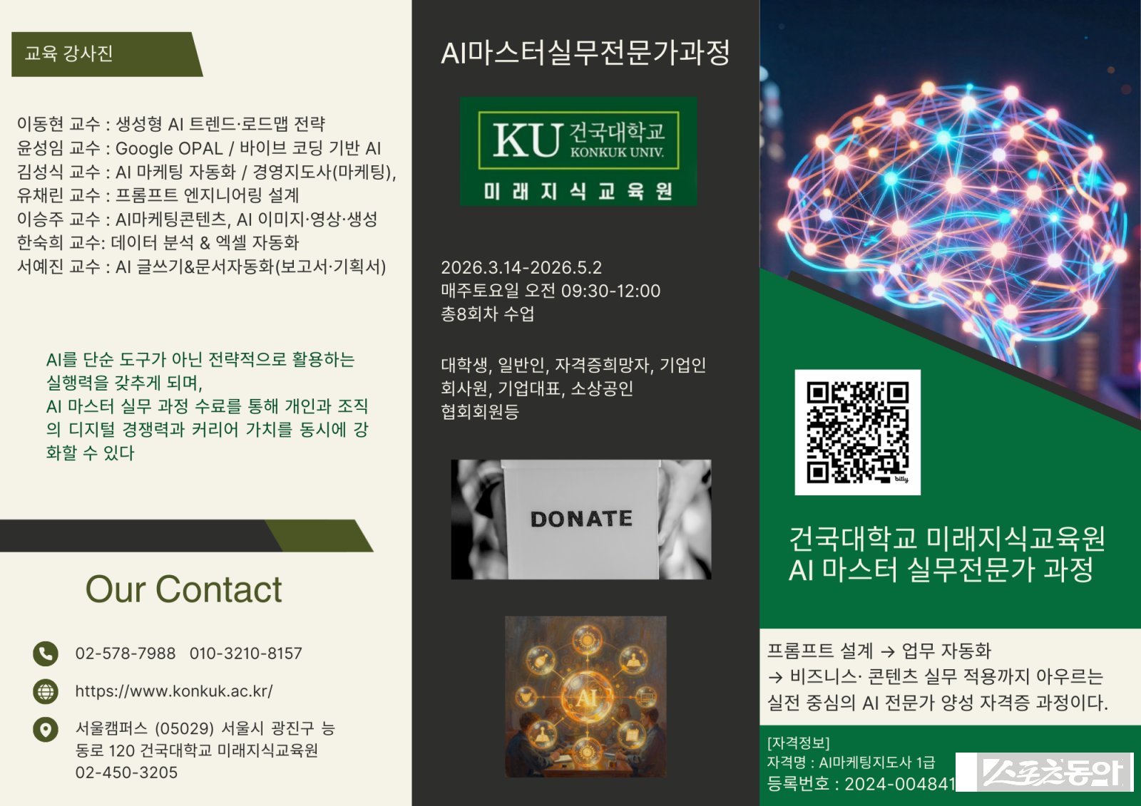 교육은 3월 14일부터 5월 2일까지 매주 토요일 오전 9시 30분부터 12시까지 진행되며, 장소는 건국대학교 서울캠퍼스 미래지식교육원이다.