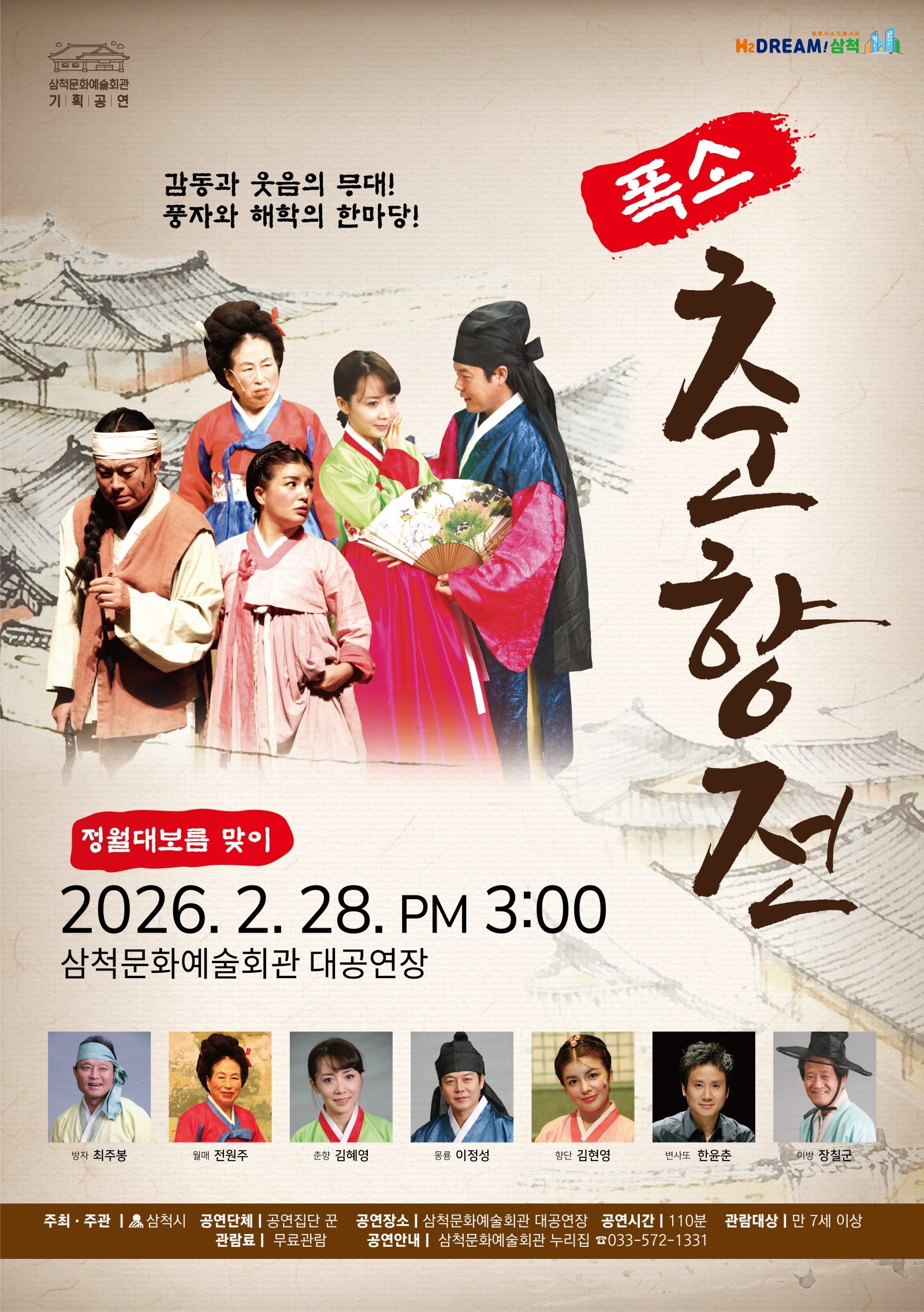 삼척시는 오는 28일 삼척문화예술회관 대공연장에서 악극 ‘폭소 춘향전’을 초청해 기획공연으로 선보인다고 24일 밝혔다.