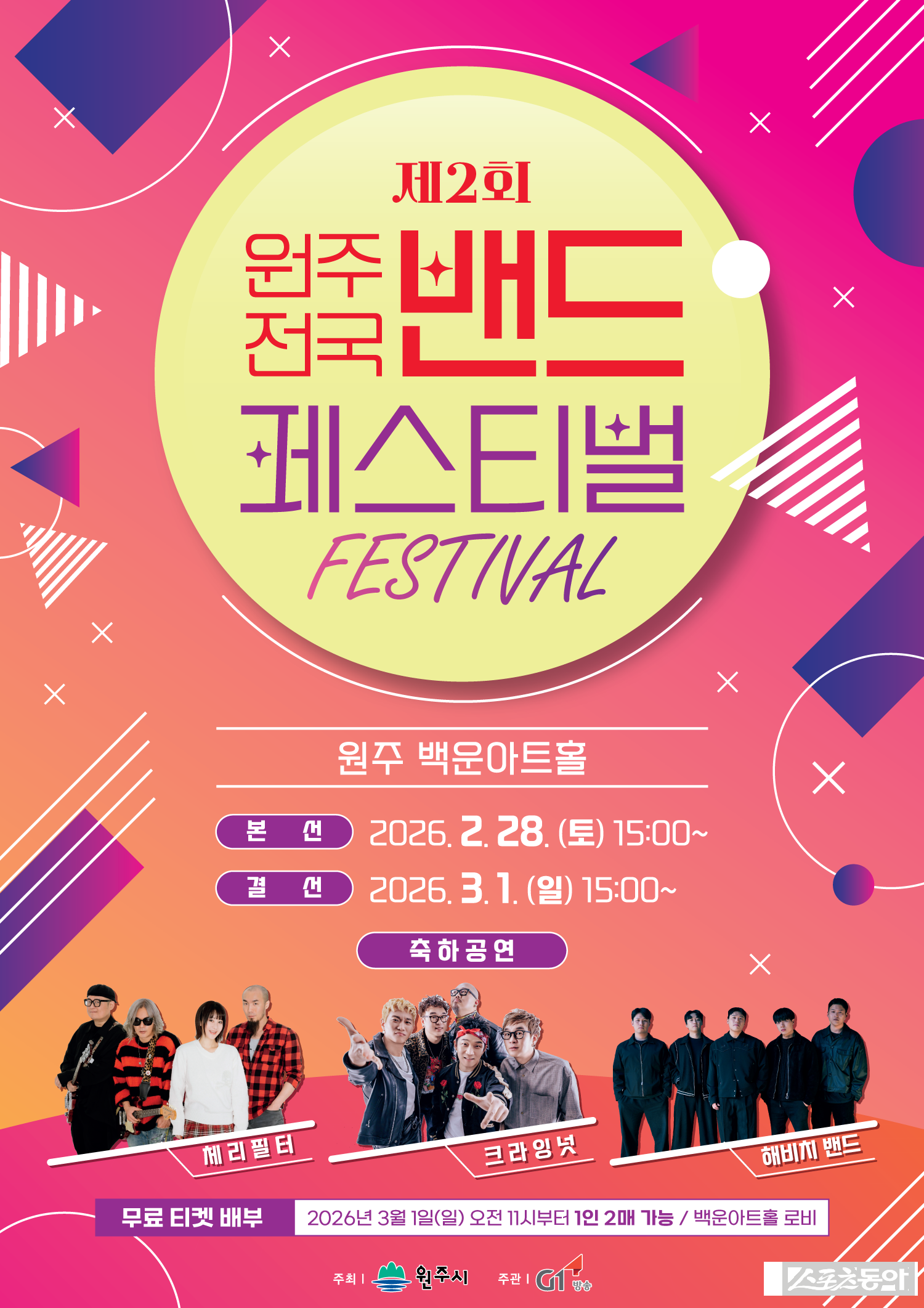 2026 제2회 원주 전국 밴드 페스티벌이 오는 28일부터 다음달 1일까지 백운아트홀에서 개최된다.원주시는 24일 이 같이 밝히며 앞서 3주간 진행된 예선 모집에는 무려 252팀이 신청해 전국 밴드들의 열정을 엿볼 수 있었다고 설명했다.