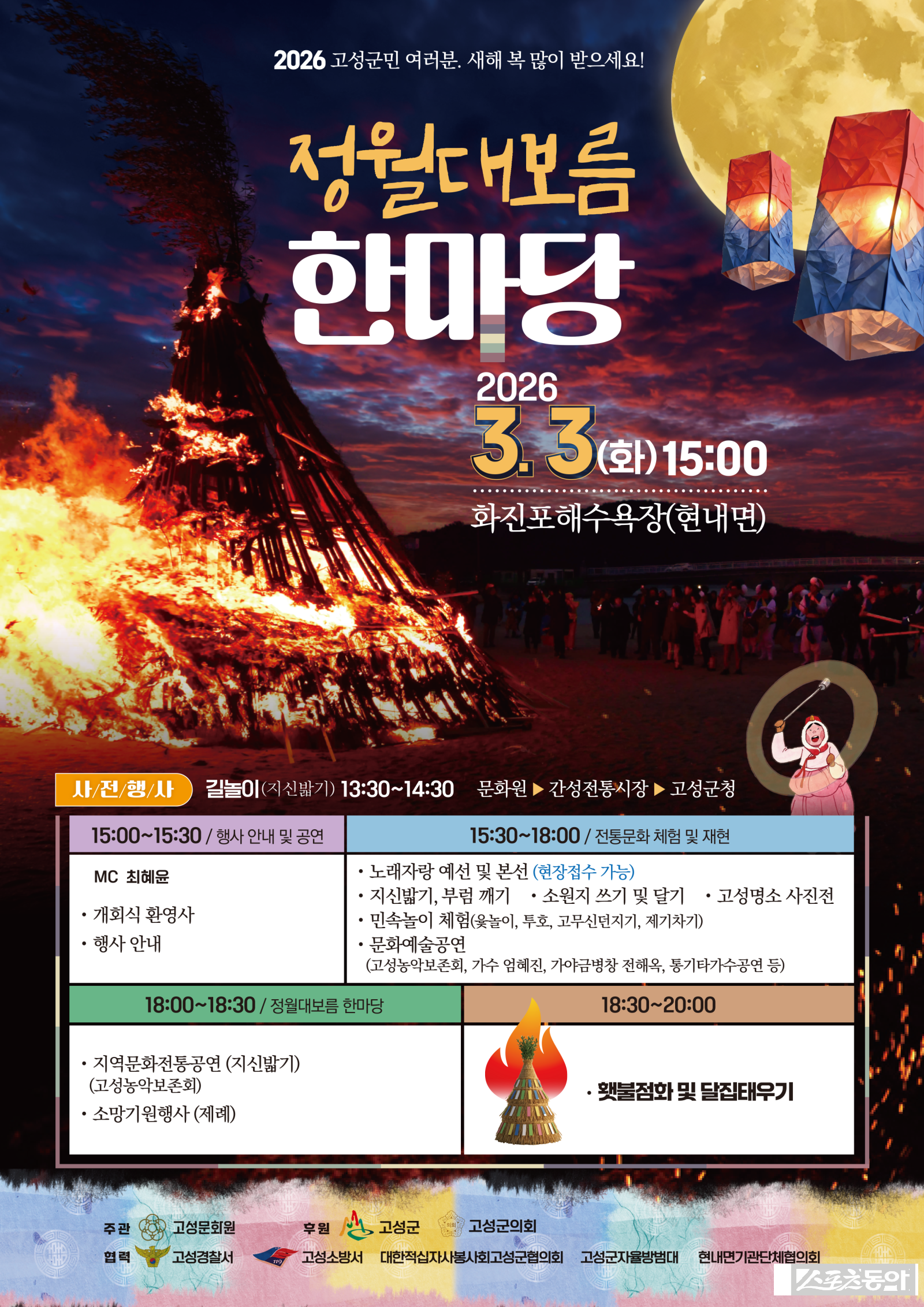 고성문화원 관계자는 “정월대보름 행사를 통해 군민 모두가 한마음으로 새해 소망을 나누고 지역 공동체의 결속을 다지는 뜻깊은 시간이 되기를 바란다”면서 “안전관리에도 빈틈없이 대응해 누구나 안심하고 참여할 수 있도록 철저히 준비하겠다”고 말했다.