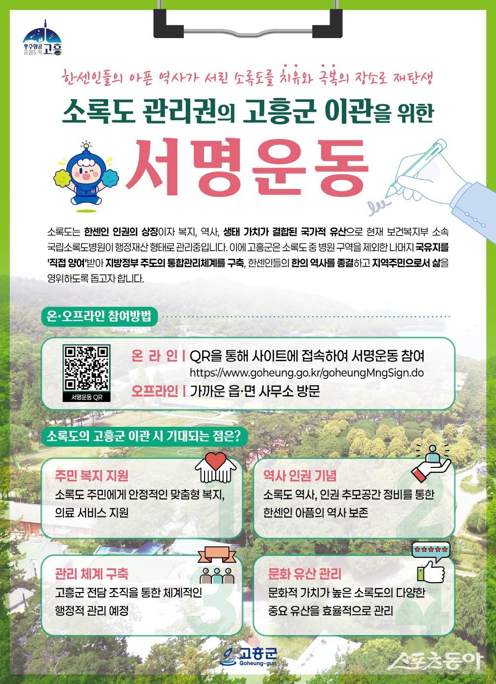 고흥군은 병원 구역을 제외한 국유지를 양여 받아 지방정부 주도의 통합 관리 체계를 구축하기 위해 이번 서명운동을 기획했다.