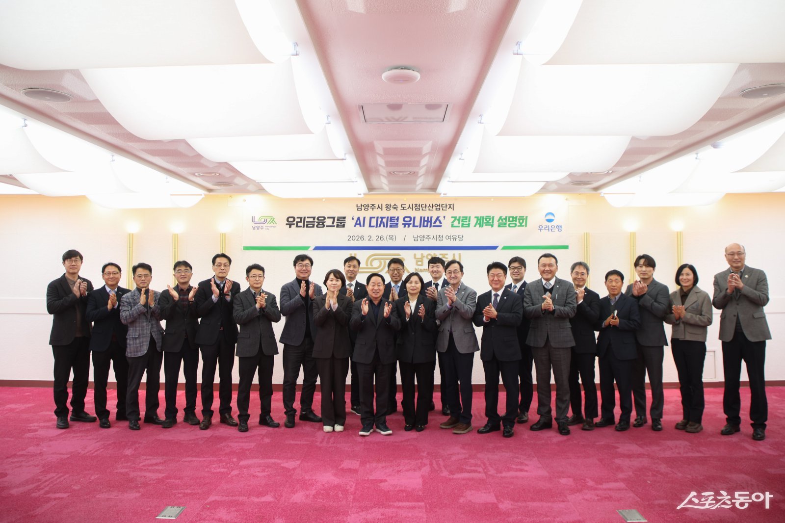 주광덕 시장은 26일 시청 여유당에서 우리금융그룹 ‘AI 디지털 유니버스’ 건립 계획 설명회를 열고 기념 촬영ㅎ고 있다. 사진제공ㅣ남양주시