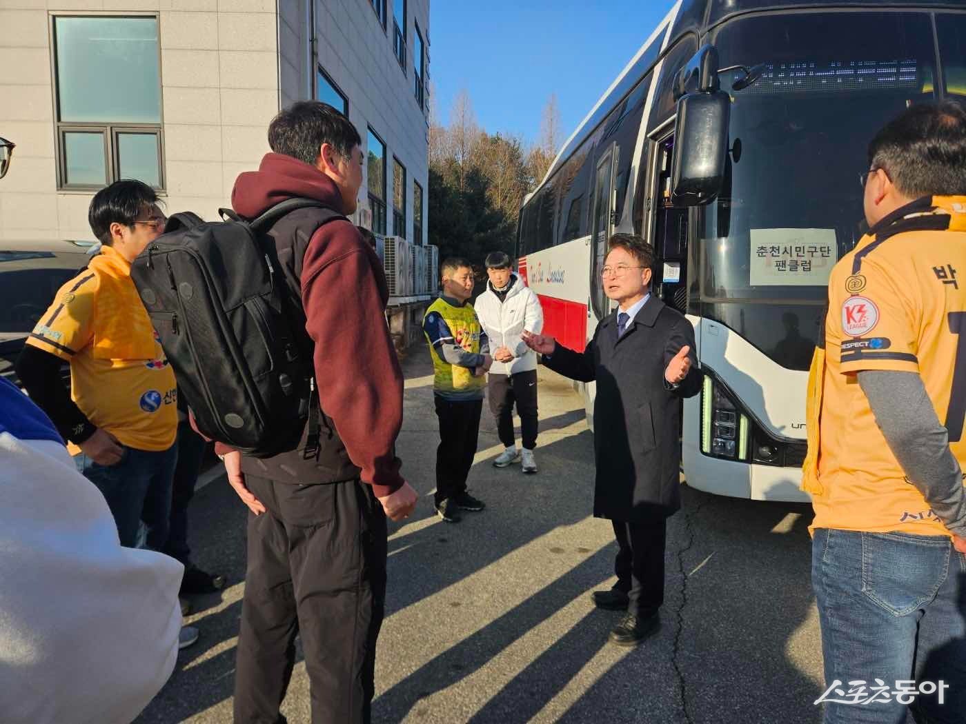 육동한 춘천시장이 K3리그 시즌 개막전을 앞두고 원정 응원에 나서는 춘천시민축구단 서포터즈를 직접 환송하며 선수단의 선전을 기원했다.춘천시민축구단 서포터즈는 8일 오후 2시 대전에서 열리는 개막전 응원을 위해 이른 아침부터 춘천종합체육관에 집결해 원정 버스에 올랐다. 육 시장은 현장을 찾아 자발적으로 참여한 팬클럽과 시민들을 격려하며 축구 열기에 힘을 보탰다.