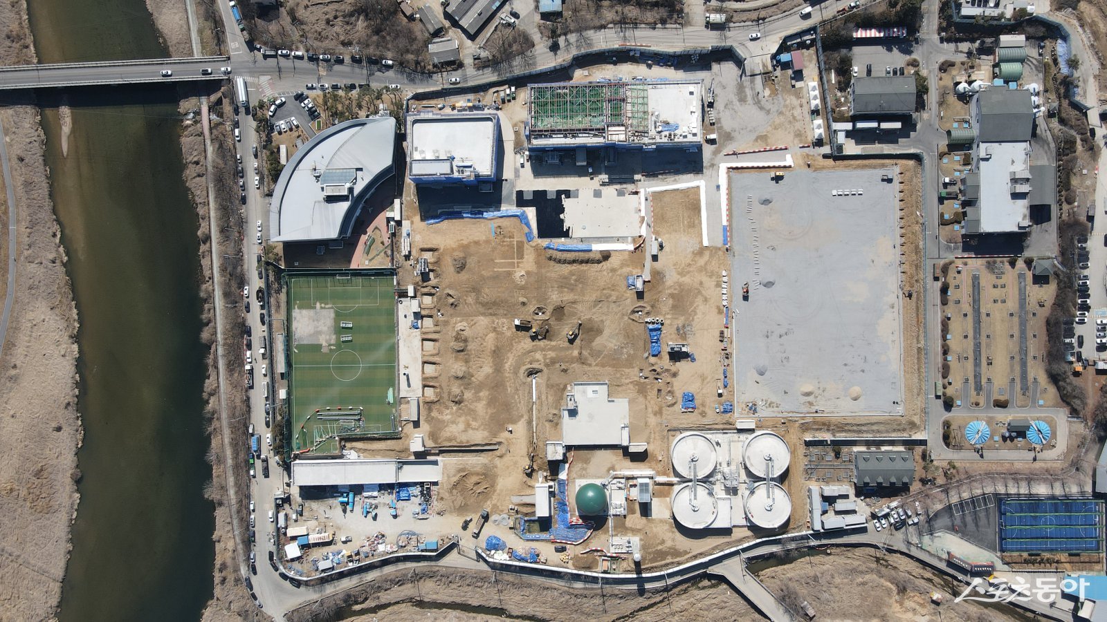 용인특례시(시장 이상일)가 혐오시설로 인식되던 환경기초시설을 지하로 내리고, 지상에는 대규모 체육공원을 조성하는 ‘용인에코타운 조성사업’을 성공적으로 마무리하며 오는 6월 준공을 앞두고 있다(용인레스피아에 건립 중인 다목적체육관 전경). 사진제공|용인시