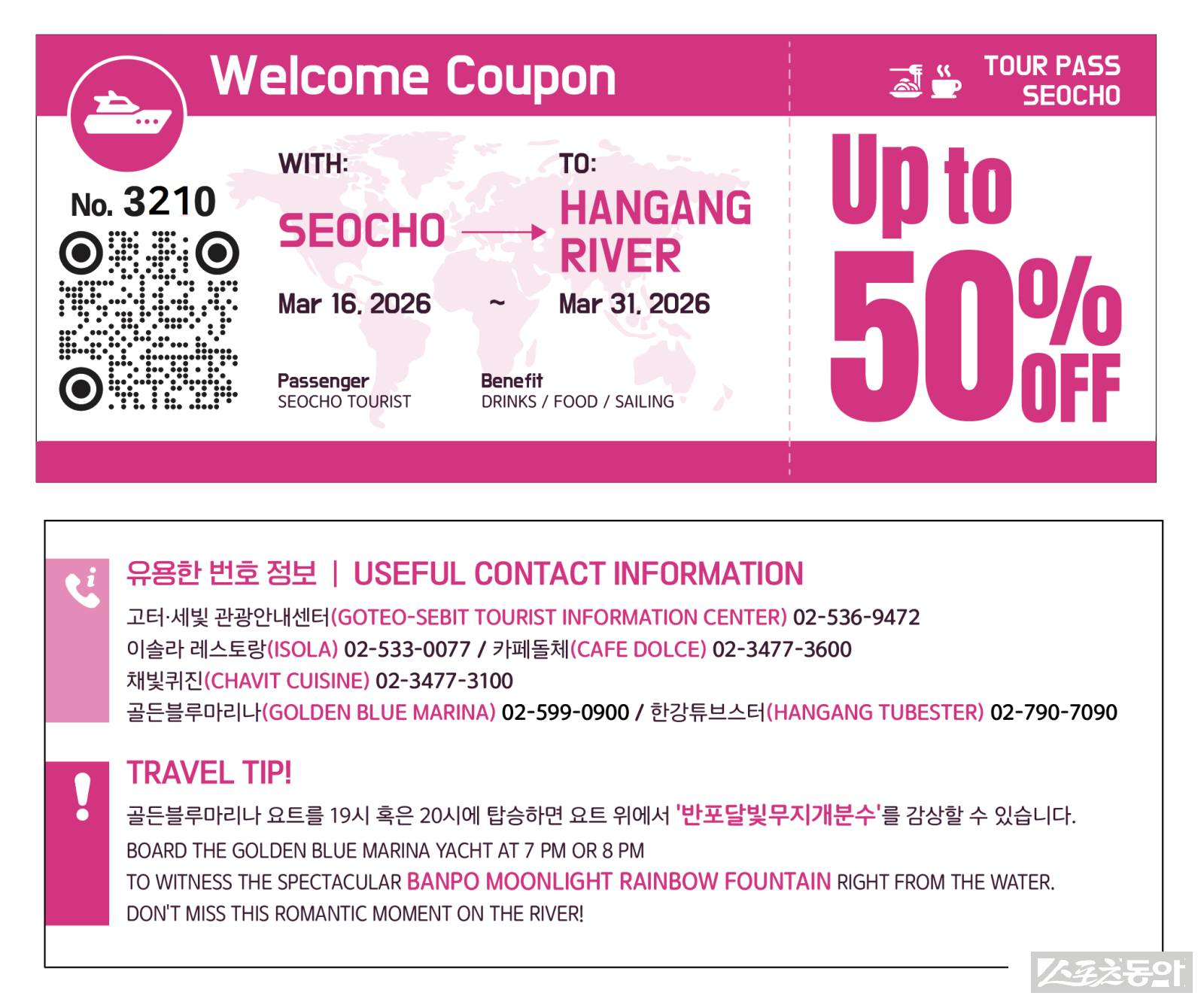 이번 이벤트는 고투몰, 반포한강공원, 피카소벽화거리 등 지역 내 주요 명소를 방문해 인증 사진을 촬영한 뒤, 필수 해시태그(#seocho, #rainbowfountain 등)와 함께 개인 SNS에 게시하는 방식으로 참여할 수 있다. 게시물을 고터·세빛 관광안내센터에 제시하면 선착순 3,210명에게 최대 50% 할인 혜택이 담긴 ‘서초 웰컴쿠폰’을 제공한다.