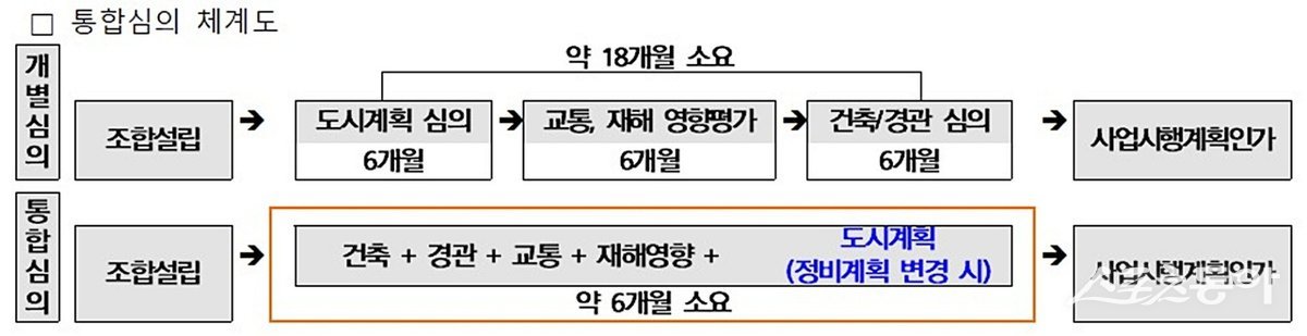 특히 가장 눈에 띄는 변화는 ‘통합 심의 체계’의 도입이다. 기존에 건축, 경관, 교통, 재해영향, 도시계획 등 개별적으로 진행되던 심의를 한 번에 처리함으로써, 통상 18개월 이상 걸리던 인허가 기간을 6개월 내외로 약 1년가량 단축했다.