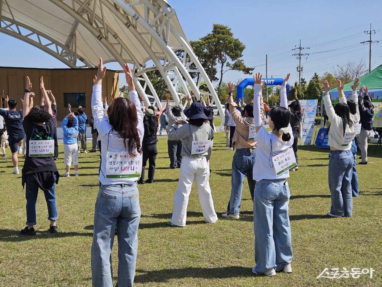 ‘함께 걸으며 치매 극복해요!’ 걷기행사 참가자들이 걷기 전 몸을 푸는 준비운동을 하고 있다. 사진제공=고흥군