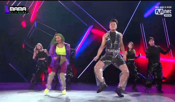 가수 박진영과 마마무 화사가 ‘2019 MAMA’에서 ‘비닐 패션’을 선보이며 파격적인 무대를 꾸몄다.