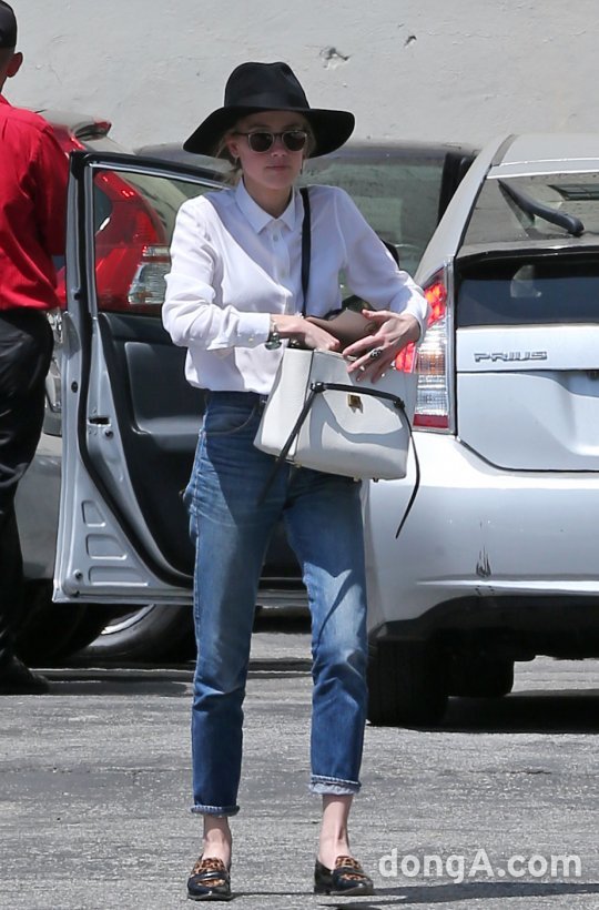 공개된 사진에는 흰 셔츠, 청바지에 단화를 착용한 수수한 차림으로 자신의 차에서 내리는 엠버 허드의 모습이 담겼다.
