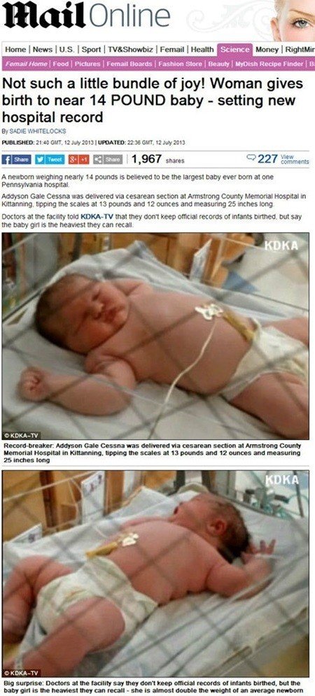 지난해 영국 데일리메일은 미국 펜실베이니아주 암스트롱 카운티의 한 병원에서 몸무게 6.2kg, 키 63.5cm의 슈퍼 베이비가 태어났다고 전했다.