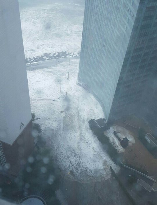 제18호 태풍 '차바'(CHABA)가 제주를 거쳐 부산을 강타하면서 해운대 마린시티까지 바닷물이 범람하고 있다.
