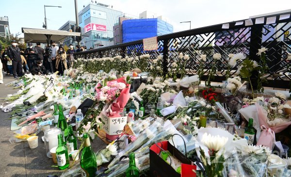 31일 서울 용산구 이태원역 1번 출구 인근에 마련된 이태원 참사 임시 추모공간에서 시민들이 추모를 하고 있다.