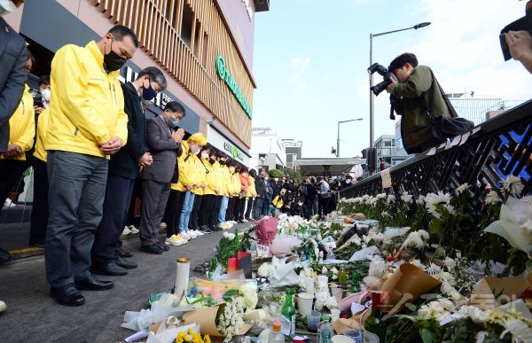 31일 서울 용산구 이태원역 1번 출구 인근에 마련된 이태원 참사 임시 추모공간에서 세월호 참사 유가족들이 추모를 하고 있다.