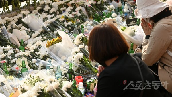 31일 서울 용산구 이태원역 1번 출구 인근에 마련된 이태원 참사 임시 추모공간에서 시민들이 추모를 하고 있다.