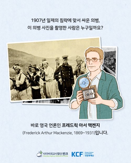 프레드릭 아서 맥켄지(Frederick Arthur Mackenzie 1869~1931)는 영국의 언론인이었다. 항일 의병을 직접 만나 취재한 1908년 ‘대한제국의 비극(Tragedy of Korea)’, 1919년 3.1운동을 기록한 1920년 ‘한국의 독립운동(Korea’s fight for freedom)’을 각각 출판해 일제의 폭압과 침탈의 실상, 한국인의 독립운동 활동을 국제사회에 알렸다.
