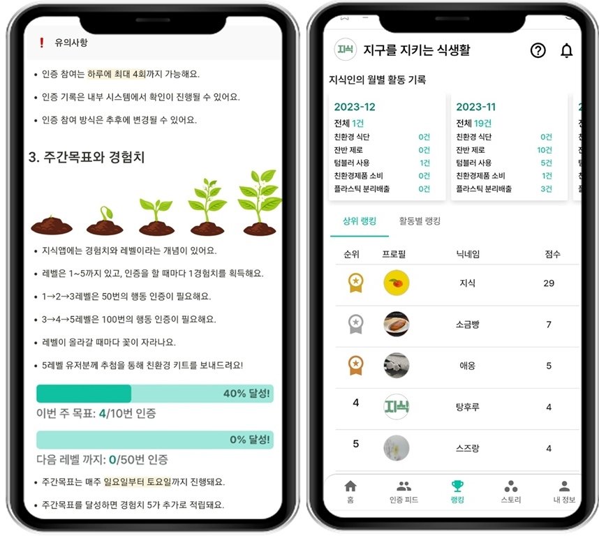 가입과 동시에 챌린지에 참여할 수 있으며, 첫 로그인 시 챌린지 참여를 알리는 가상의 나무 씨앗을 받게 된다. 지식 프로젝트가 제안하는 개인별 기후행동 실천 횟수와 실적에 따라 씨앗이 단계별로 성장해 꽃나무가 되면 ‘지식인’ 뱃지를 획득할 수 있다.