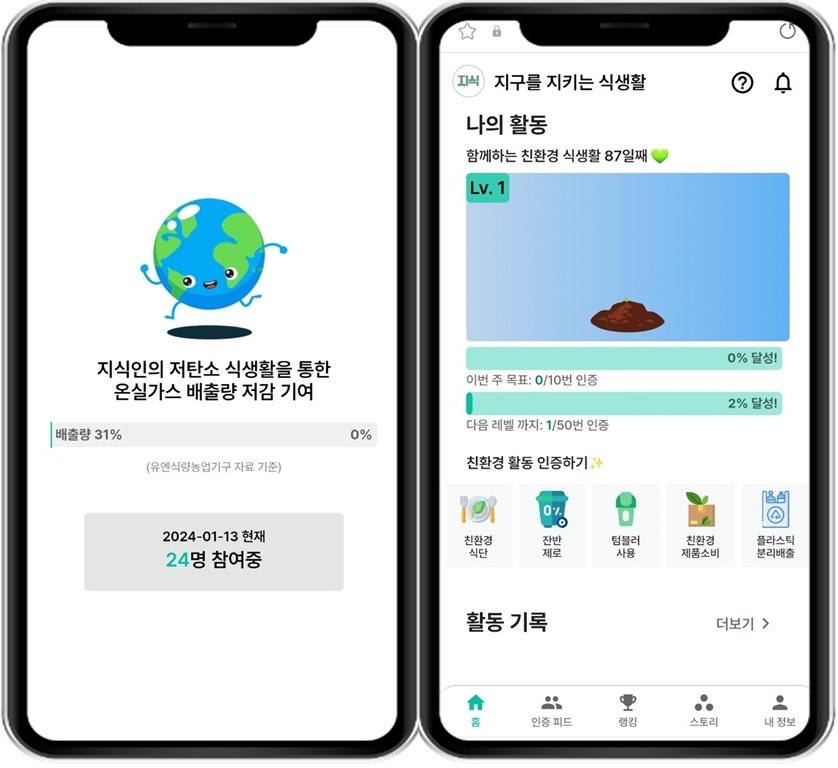 지식 프로젝트 사이트에 접속해 개인별 SNS계정으로 간편하게 가입할 수 있다. 식탁 위 기후행동 챌린지 참여 및 인증, 누적 참여 조회 등을 통해 나의 저탄소 생활 습관을 쉽게 확인하고 관리할 수 있다.