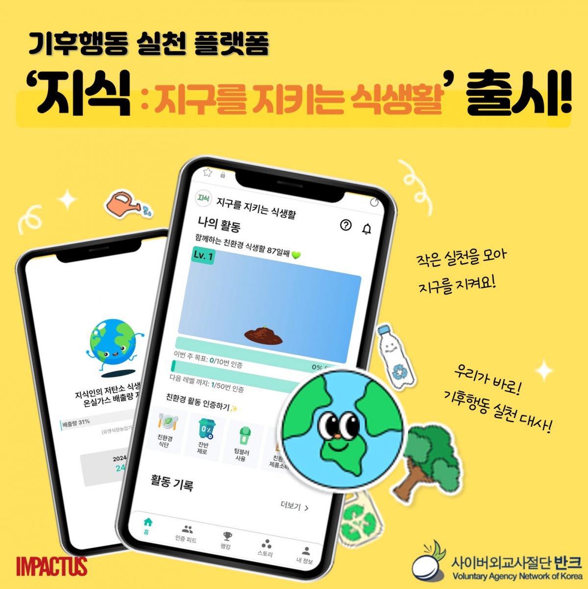 사이버외교사절단 반크(단장 박기태)와 소셜벤처 임팩터스(대표 김보경)가 식탁 위 탄소 배출량을 줄이는 통합 실천 플랫폼 ‘지구를 지키는 식생활(지식)’ 프로젝트를 오픈한다고 밝혔다.‘지식’ 프로젝트는 대한민국 청소년, 대학생을 중심으로 기후위기의 심각성과 탄소 중립 실천의 중요성을 인식하고 저탄소 생활 습관을 ‘챌린지’ 형태로 실천하도록 돕는 프로젝트이다.