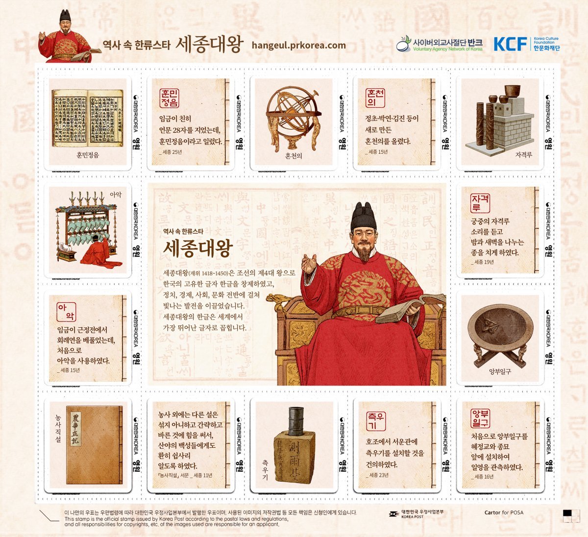 세종대왕 기념우표는 세종대왕의 업적을 소개하는 훈민정음, 혼천의, 자격루, 앙부일구, 측우기, 농사직설, 아악 그림 7개와 세종실록의 관련 기록 7개로 구성했다. 세종실록을 포함한 조선왕조실록은 유네스코 세계기록유산으로 등재된 한국의 세계적인 유산이다.
