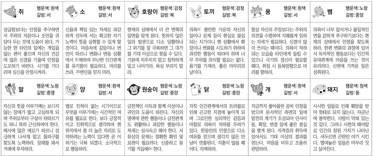 토끼띠 : 의욕이충만한가운데자신의일이나문제등이현실로돌입되는시기이니현상황에서확장이나변화를시도하기위하여과감한행동이따라야하며너무주위를의식할필요는없다.용기를가져라.좋은마무리의날이다.