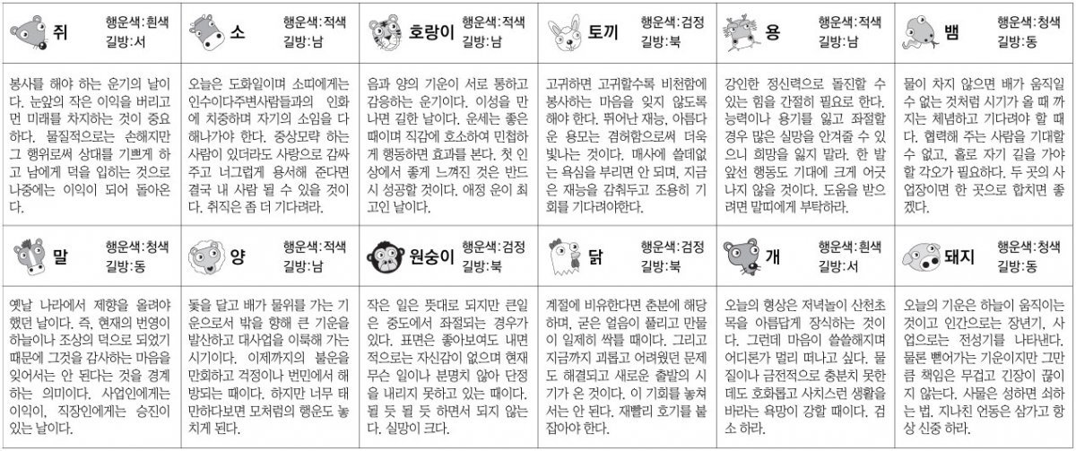 쥐띠 : 봉사를해야하는운기의날이다.눈앞의작은이익을버리고먼미래를차지하는것이중요하다.물질적으로는손해지만그행위로써상대를기쁘게하고남에게덕을입히는것으로나중에는이익이되어돌아온다.