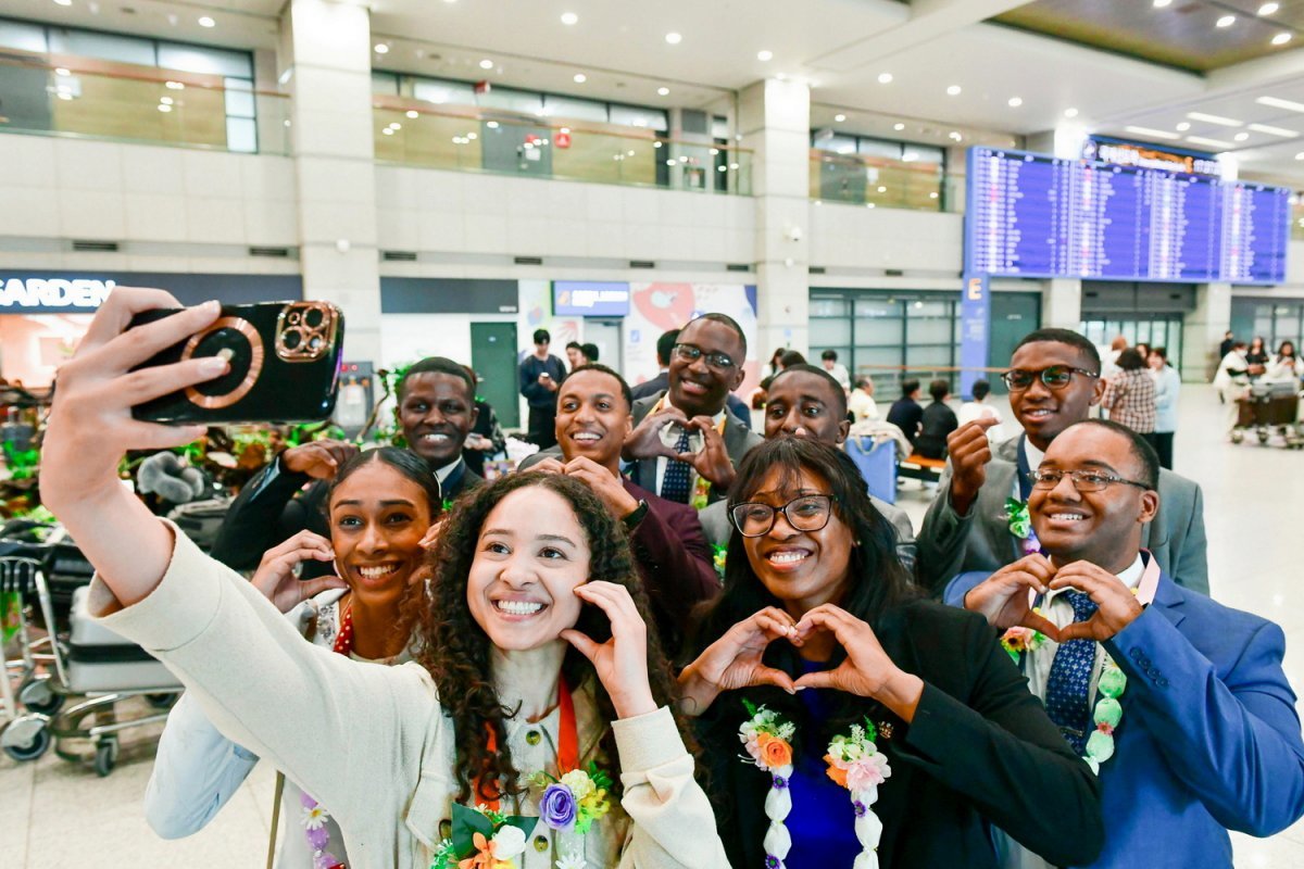 82차 해외성도방문단으로 방한한 미국, 캐나다, 멕시코 등지 하나님의 교회 신자들이 인천국제공항으로 입국했다. 한국 신자들이 걸어준 사탕목걸이를 하고 사진을 찍고 있다. 하나님의교회 세계복음선교협회 제공