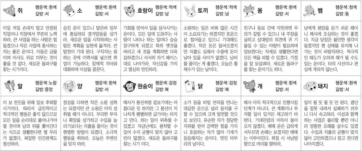 돼지띠 : 일이될듯될듯안된다.결단을 잘못 내려서 실패하기 쉬우니 다시숙고하라. 이성과 함께하는 사업은 불리할 뿐만 아니라 엉뚱한 오해를 살수도 있겠다. 수입과 지출의 균형이 맞지않아고민하겠으나참고견디면나아지겠다.