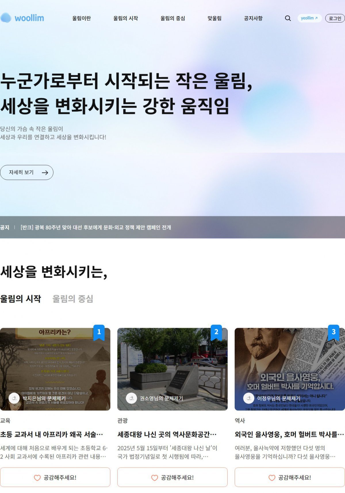 ‘열림’은 광복 80주년 3·1절을 기념해 반크가 새롭게 선보인 국가정책 소통 플랫폼으로, 정부의 정책과 콘텐츠를 국민에게 투명하게 공유하고, 이에 대한 국민의 의견을 직접 수렴하는 구조를 갖췄다. 단순한 정보 제공을 넘어, 국민이 정책 설계 단계부터 주도적으로 참여할 수 있도록 고안된 ‘열림’은 ‘정책의 수혜자’가 아닌 ‘국정의 공동 설계자’로서 국민의 역할을 재정립하는 데 중점을 두고 있다.