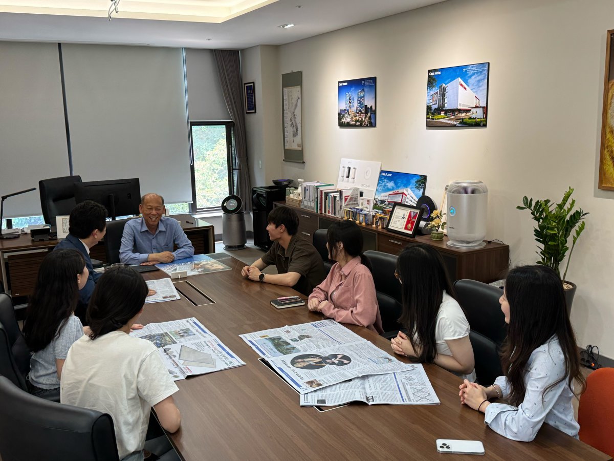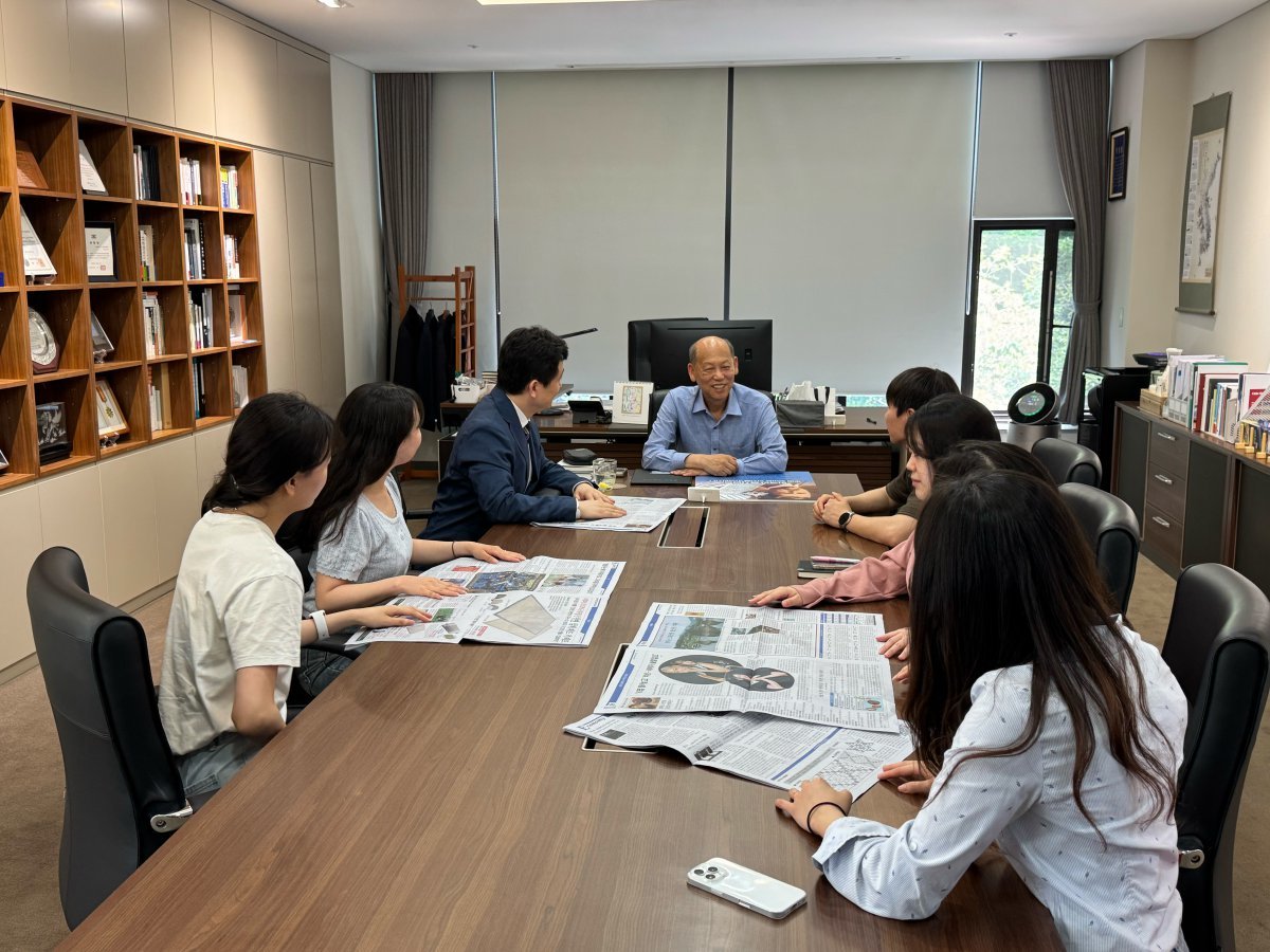 김준일 한문화재단 이사장(가운데)과 반크 연구원들이 ‘플레이 K-푸드 월드컵’ 기사가 실린 스포츠동아를 보며 세미나를 하고 있는 모습.