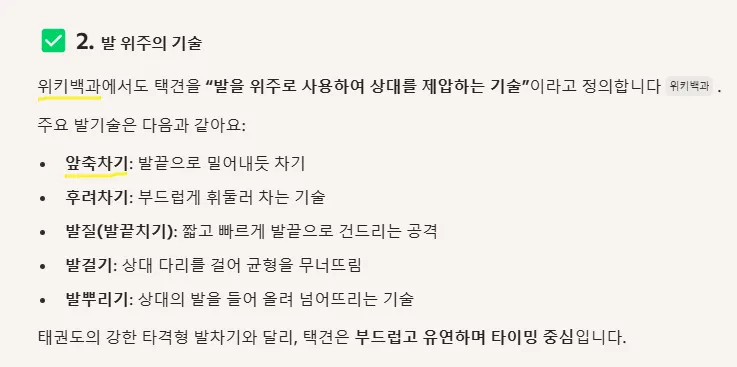 예를 들어, 그록(Grok)은 택견의 ‘곡선·휘둘러 차기’ 특징을 설명하면서 앞굽걸이, 옆굽걸이, 뒤굽걸이 등 태권도 용어와 혼동한 기술명을 서술했고, ‘밀고 당기기’ 동작을 설명하면서 품 씻기, 품 바르기와 같이 존재하지 않는 기술명을 예시로 들었다. 또한 코파일럿(Copilot)은 택견 발기술로 ‘앞축차기’를 소개하며, 실제 택견 기술과 다른 내용을 제시했다.