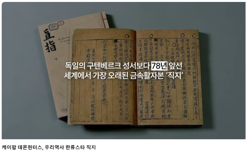 이어 영상은 세계 최초의 금속활자본 ‘직지심체요절(직지)’로 시선을 옮긴다. 미국 타임지가 선정한 ‘지난 천 년 동안 인류를 바꾼 100대 사건’ 1위가 ‘금속활자 인쇄술’임을 언급하며, 독일의 구텐베르크 성서보다 78년 앞서 인쇄된 직지의 역사적 가치를 소개한다.